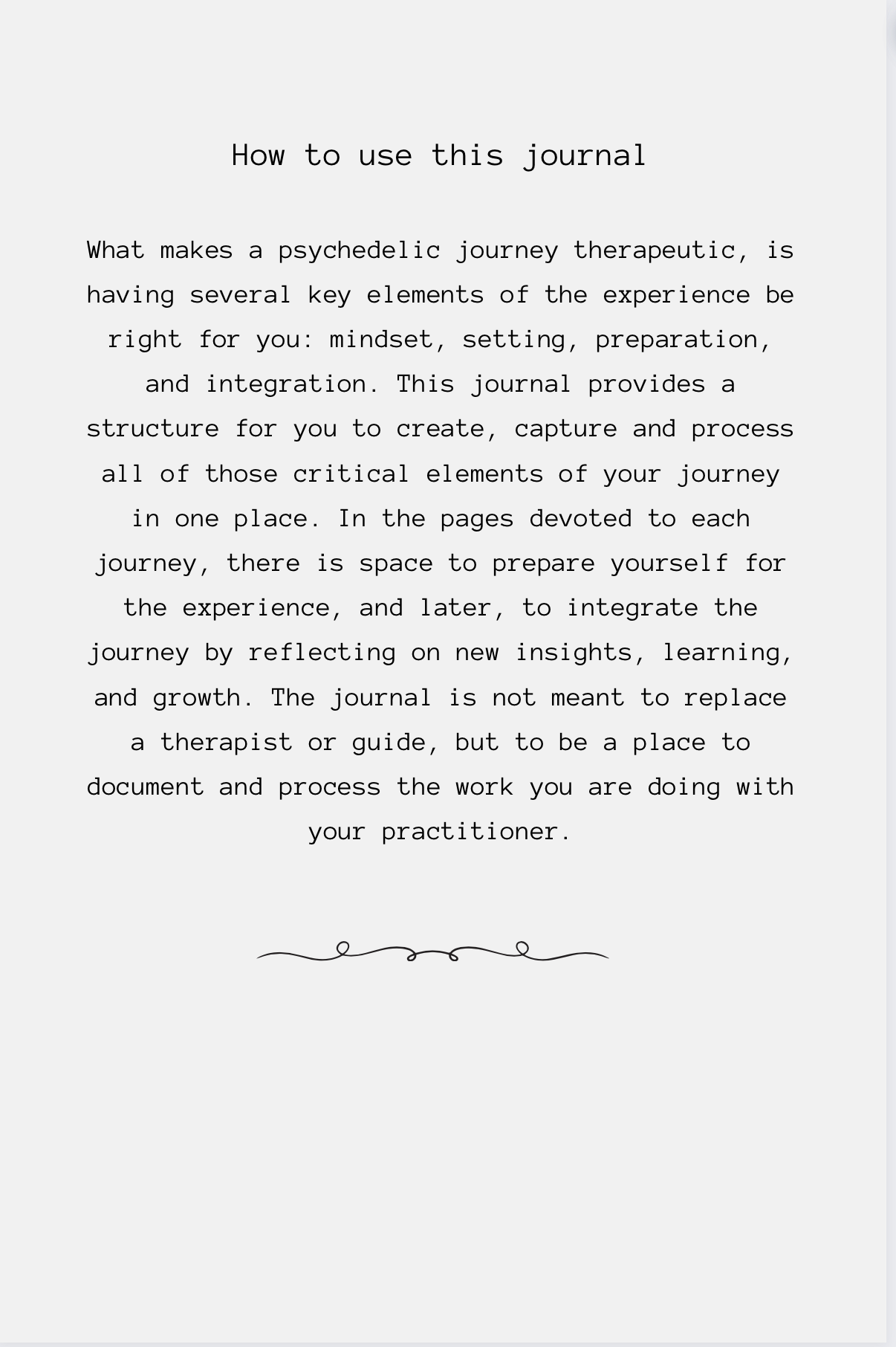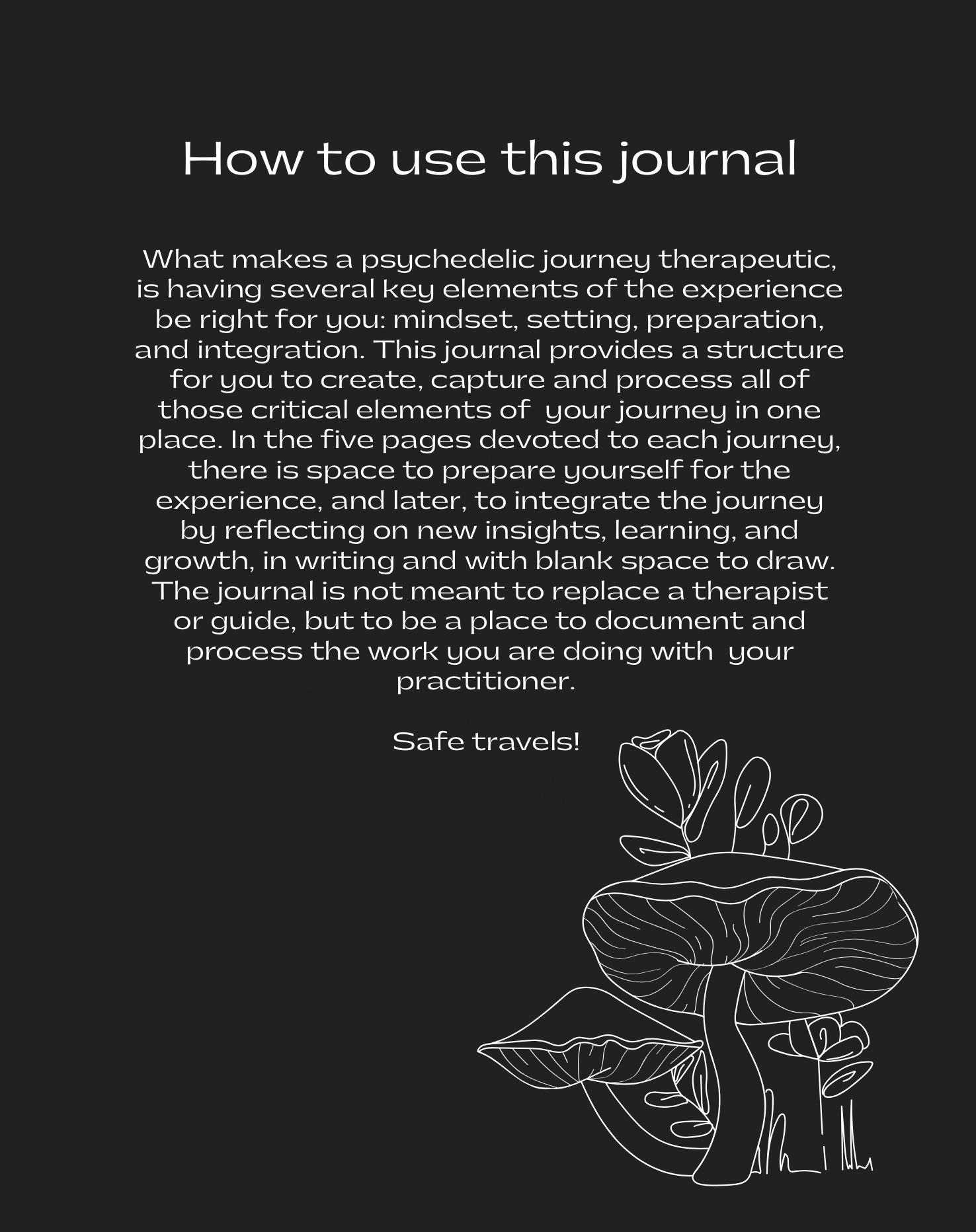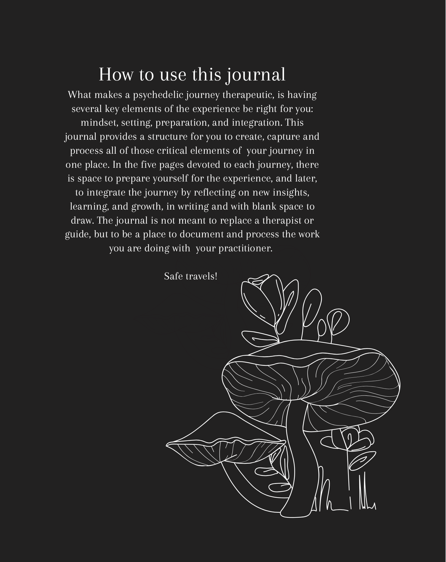 Measuring 9×6 inches, our journals are designed to be your companion for preparing, processing, documenting, and reflecting upon all your psychedelic journeys. Whether you embark on therapeutic journeys with a guide or embark on solo experiences, our journals provide a dedicated space for you to process your experiences.