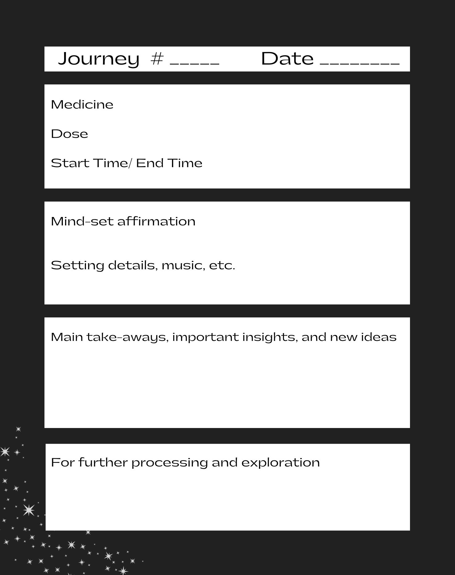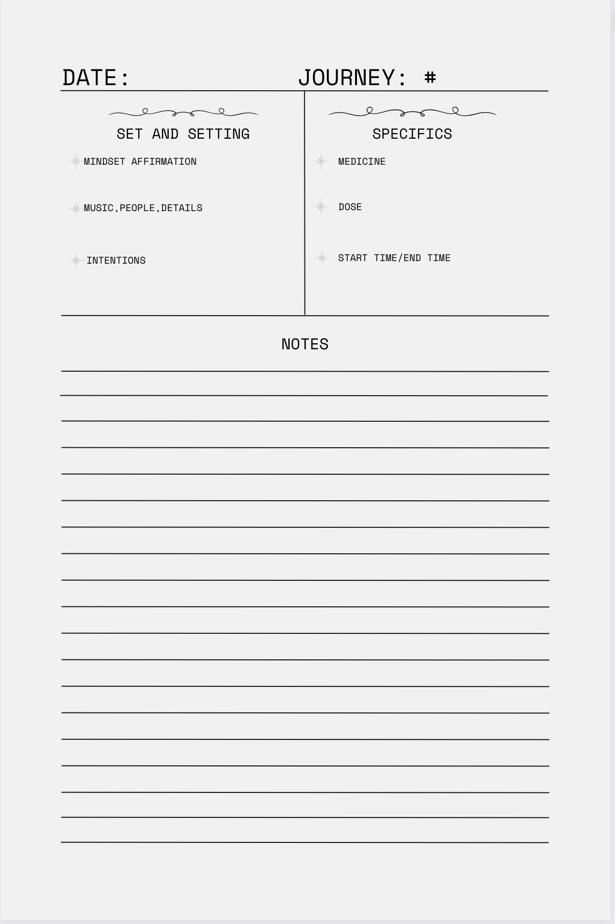 Organized for comprehensive recording, these structured, simple, and detailed journals guide you through all the essential elements of your journey, regardless of the type of medicine or setting. Capture every detail and insight to deepen your understanding and integration of your psychedelic experiences.